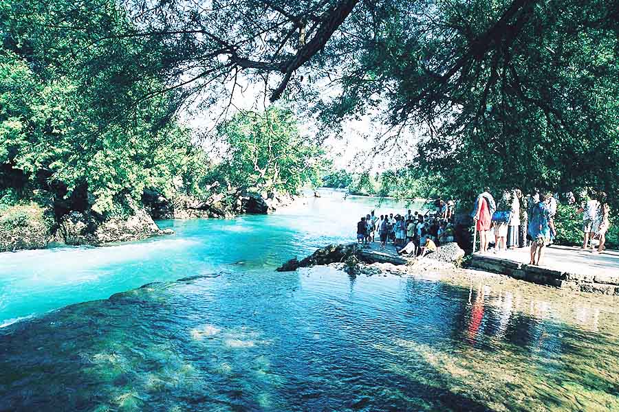 The white, foaming water of the Manavgat Waterfalls flows powerfully over the rocks. Near the waterfalls are shady tea gardens providing a pleasant resting place.